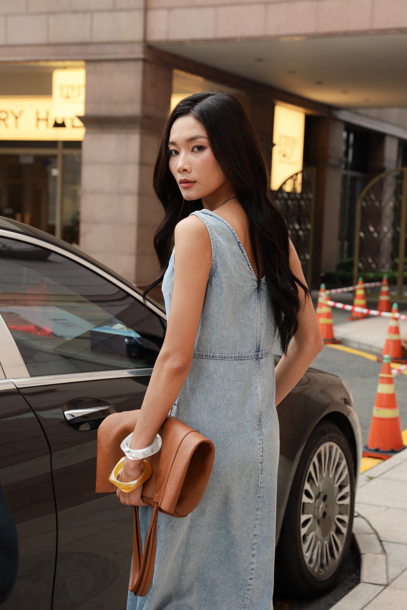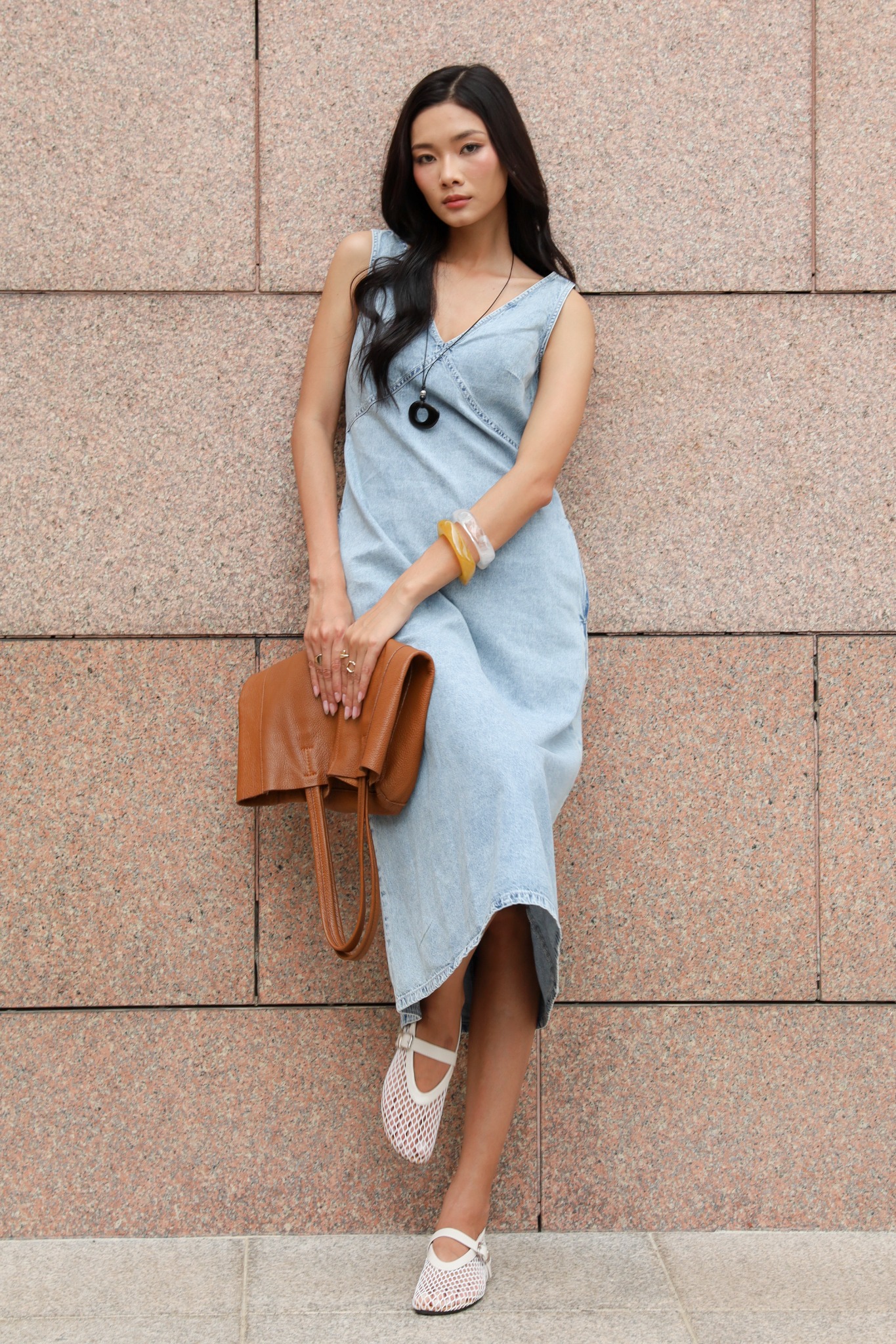 Đầm jean 2 dây cổ V dễ kết hợp với sneaker, sandal hoặc giày bệt, phù hợp mặc đi chơi, dạo phố, cà phê hoặc du lịch.