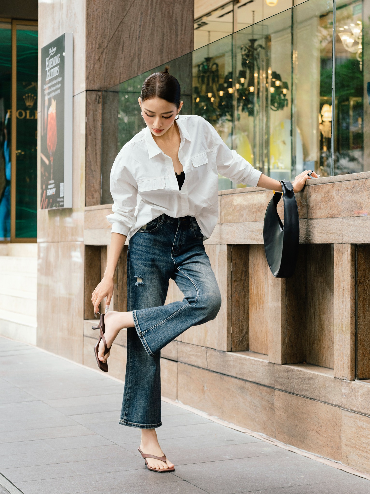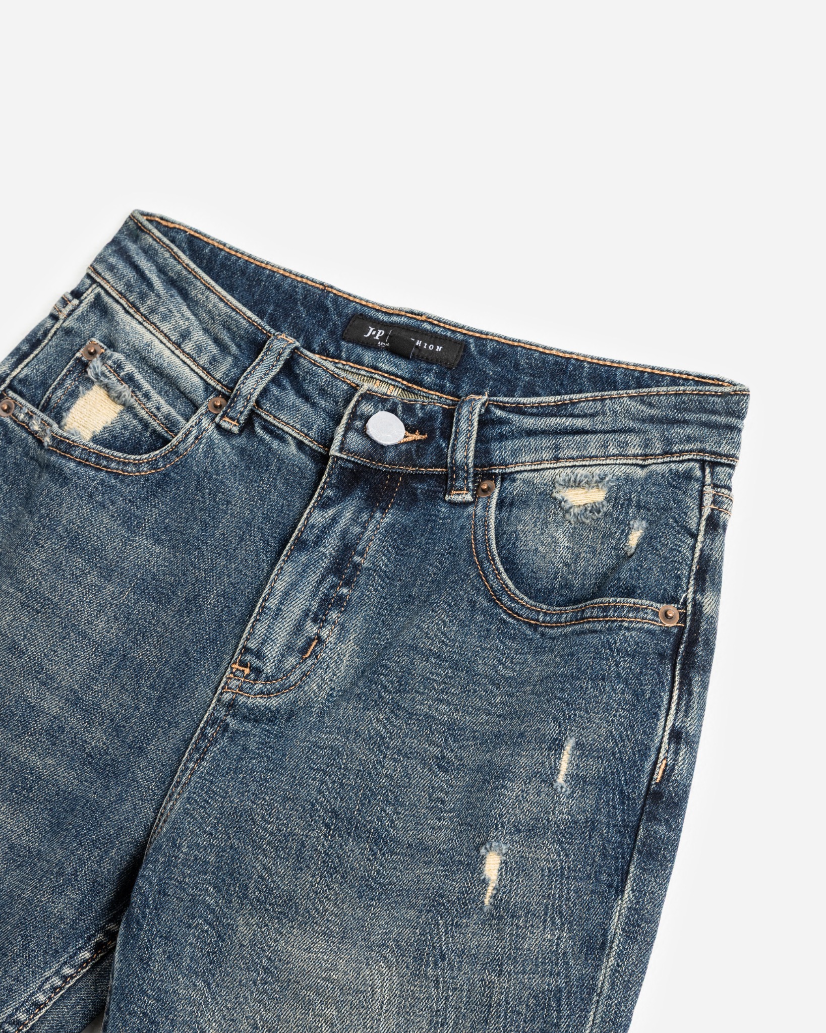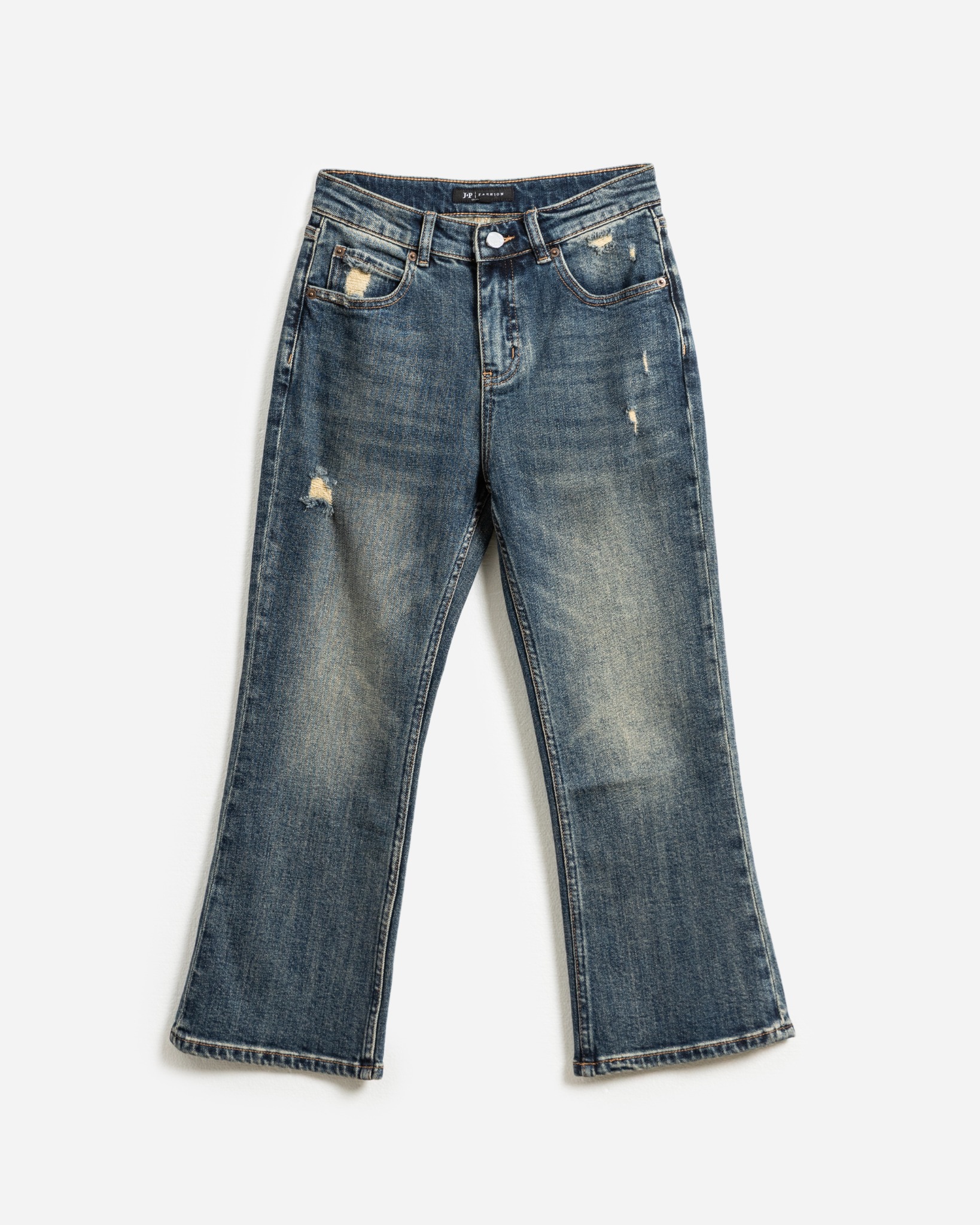 Thiết kế cạp cao, ôm trọn vòng eo, tôn dáng hiệu quả. Phần ống quần loe nhẹ ở phía dưới, giúp đôi chân trông thon dài hơn. Điểm nhấn của chiếc quần là các chi tiết rách và mài xước nhẹ nhàng, tạo vẻ bụi bặm, sành điệu. Màu xanh denim được xử lý phai màu tự nhiên, mang lại vẻ ngoài cổ điển, thời thượng.
