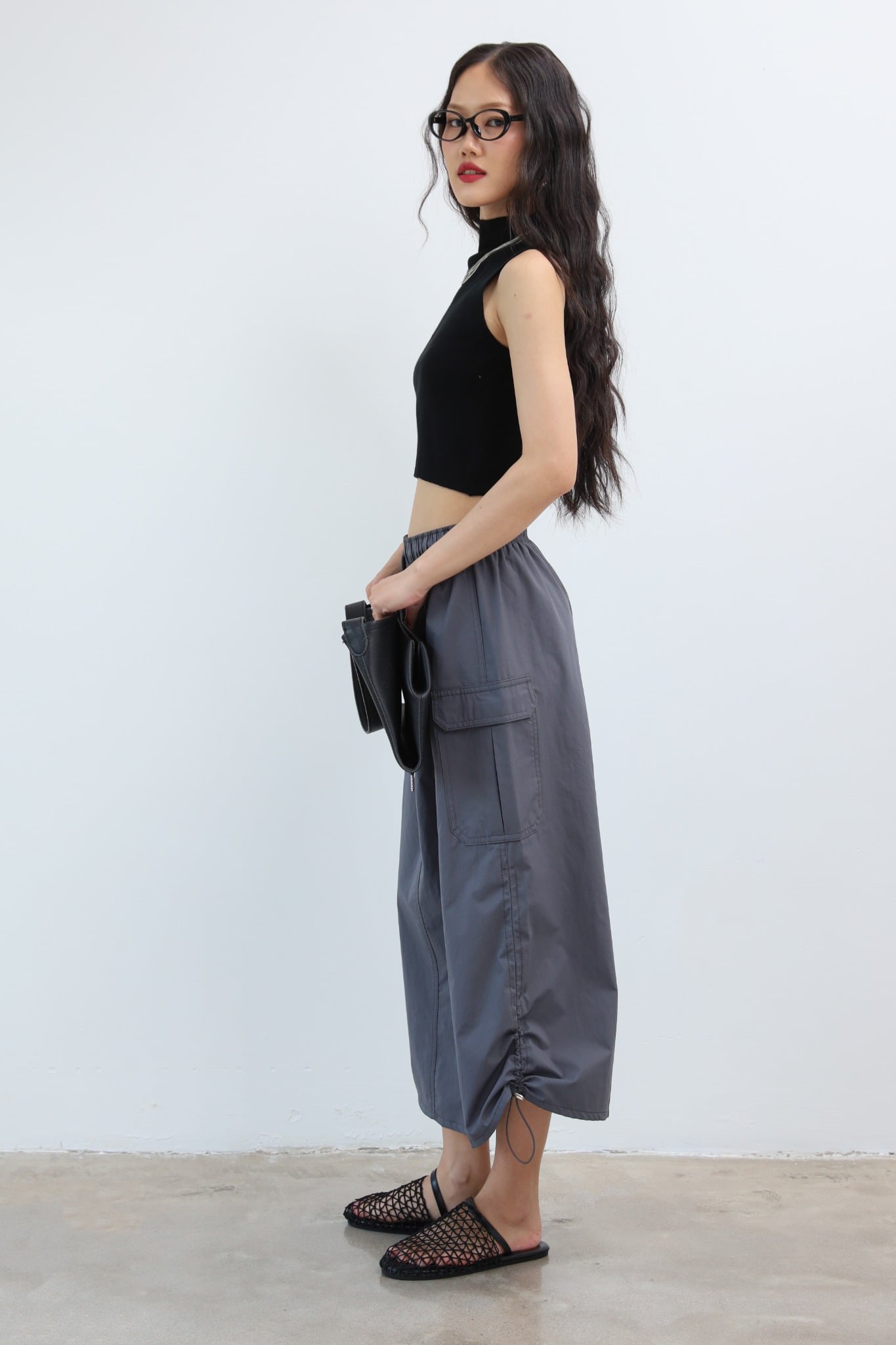 | Điểm nhấn | Túi hộp có nắp, lưng thun, dây rút eo |